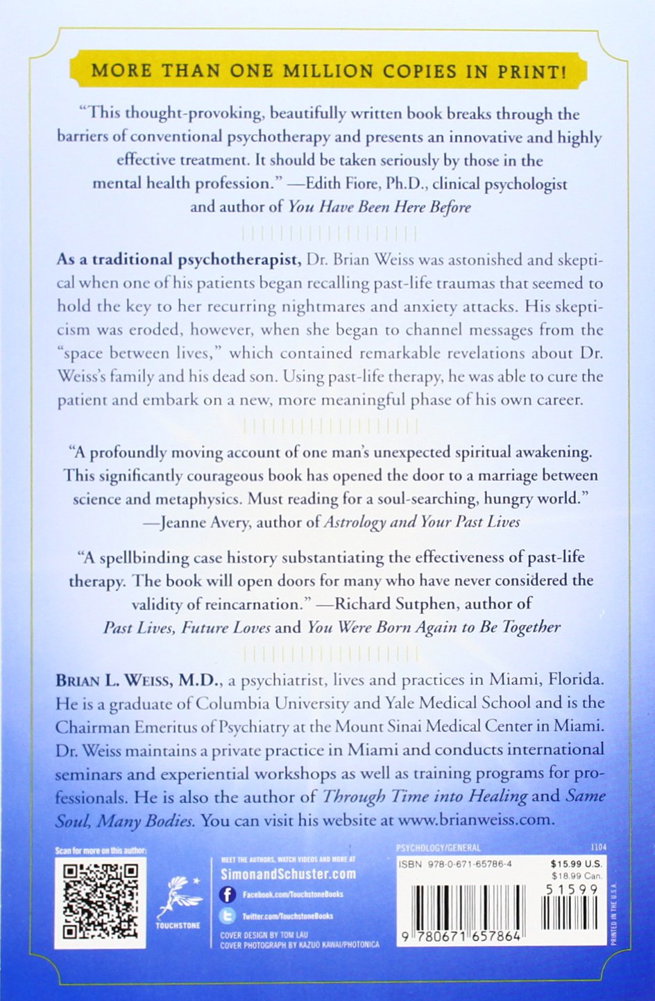 Details: Psychiatry and metaphysics blend together in this fascinating book based on a true case history. Dr. Weiss, who was once firmly entrenched in a clinical approach to psychiatry, finds himself reluctantly drawn into past-life therapy when a hypnotized client suddenly reveals details of her previous lives. During one hypnosis session his client introduces the spirit guides who have been her soul therapists in between lives. This is when the story really takes off for Weiss, who discovers that these guides have specific messages about his dead son as well as Weiss's mission in life. No, we cannot verify the truth of this story using the limited scientific tools we have available. However, it is hard to dispute that this well-respected graduate of Columbia University and Yale Medical School has discovered a personal truth that has led him to be an enormously popular speaker, author, and leader in the field of past-life therapy. --Gail Hudson